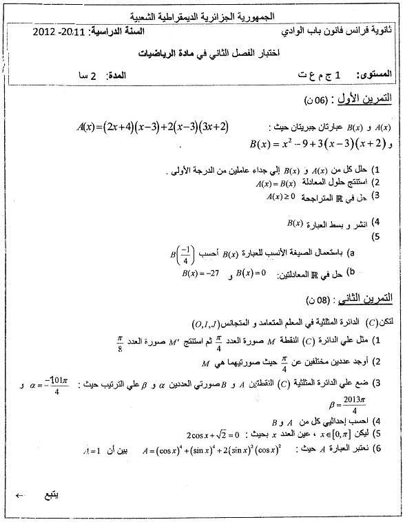 اختبار الفصل الثاني في مادة الرياضيات للسنة اولى ثانوي جذع مشترك علوم و تكنولوجيا 1 Eddirasa موقع الدراسة نت الموقع الأول للدراسة في الجزائر