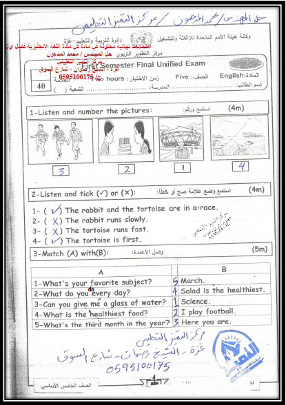 امتحانات انجليزي للصف الخامس الفصل الأول 2011 2015 المكتبة الفلسطينية الشاملة