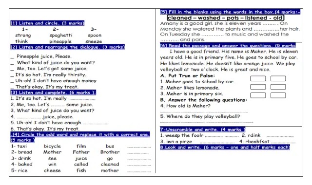 امتحان اللغة الانجليزية للصف الخامس الابتدائي المواصفات طالب