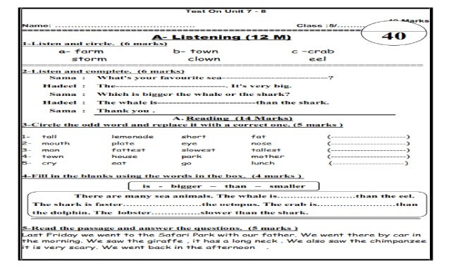 اختبارات اللغة الانجليزية للصف الخامس الفصل الدراسي الاول بوابة عمان التعليمية