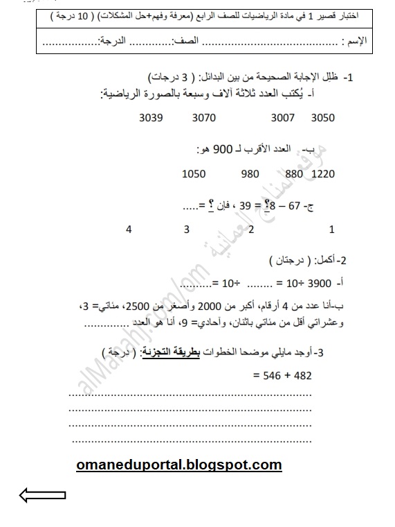 اختبار رياضيات للصف الرابع الفصل الاول
