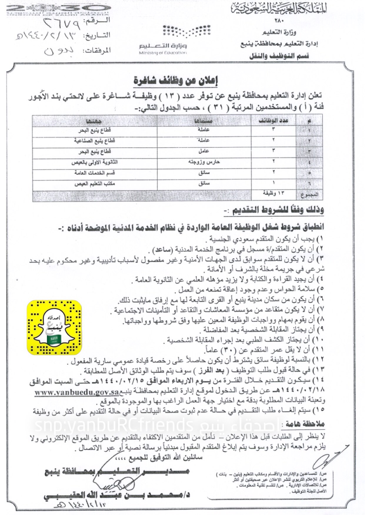 تعليم ينبع يعلن عن وظائف شاغرة على بند الأجور فئة أ