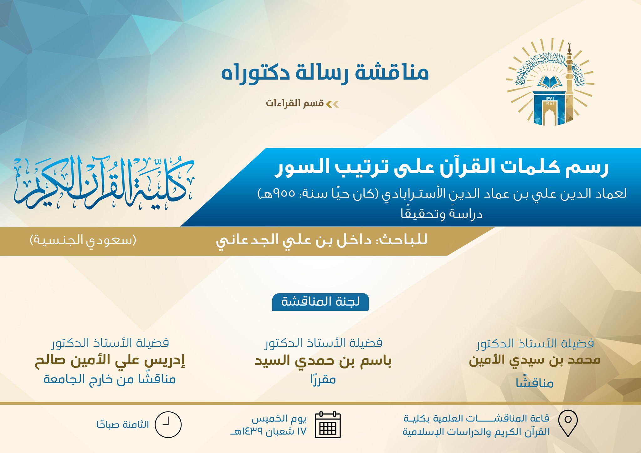 كلية القرآن الكريم على تويتر دعوة لحضور مناقشة دكتوراه رسم كلمات القرآن على ترتيب السور لعماد الدين علي بن عماد الدين الأسترابادي كان حي ا سنة 955 هـ دراسة وتحقيق ا للباحث داخل