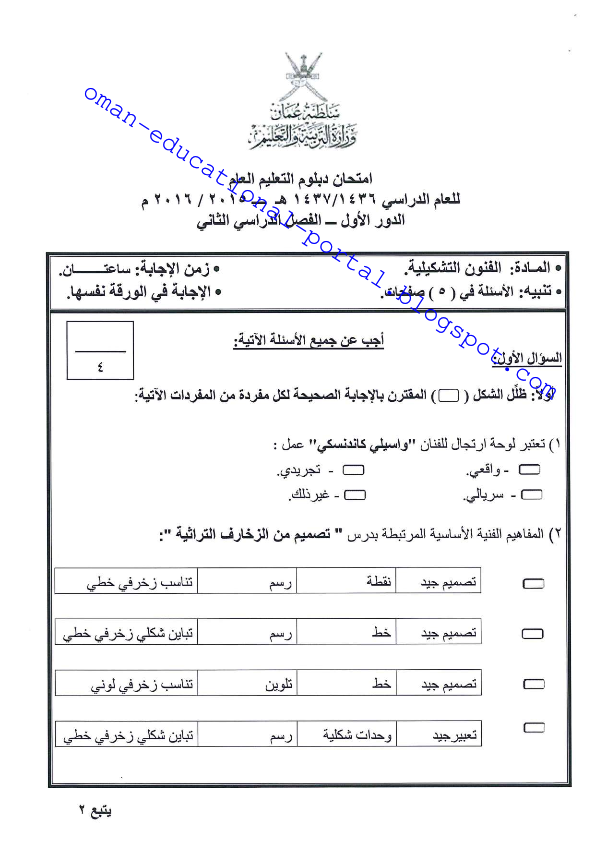 أسئلة امتحانات رسمية للسنوات سابقة 2016 2020 لمادة الفنون التشكيلية للصف الثاني عشر