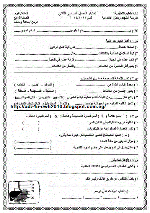 امتحانات المدارس فى العلوم للصف الرابع الابتدائى الفصل الدراسى الث