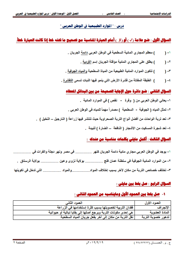 اسئلة واجوبة درس الموارد الطبيعية في الوطن العربي في الدراسات الاجتماعية للصف الخامس نصائح تربوية