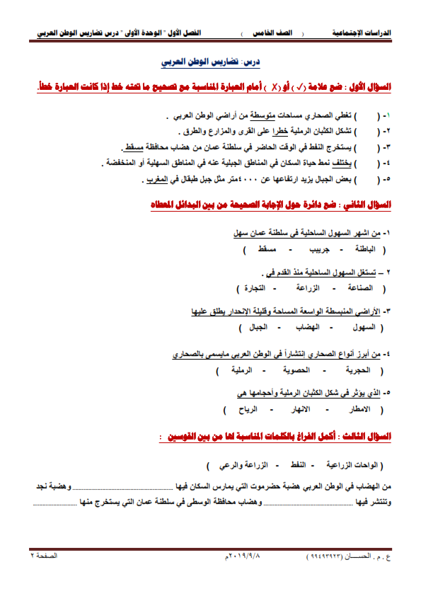 درس تضاريس الوطن العربي في الدراسات الاجتماعية الصف الخامس الفصل الاول اسئلة و جوبة