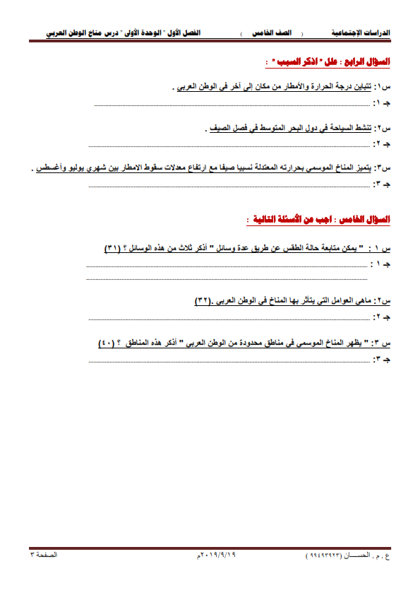 درس مناخ الوطن العربي في الدراسات الاجتماعية للصف الخامس الفصل الاول اسئلة و جوبة