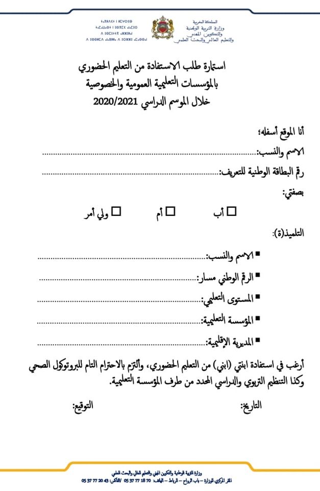 بلاغ الوزارة نموذج استمارة طلب الاستفادة من التعليم الحضوري 2021 2020