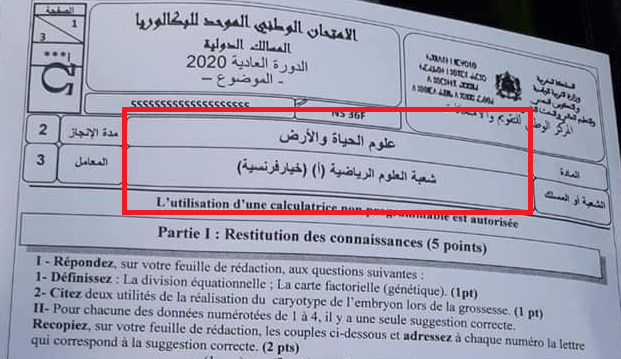 الامتحان الوطني لمادة علوم الحياة والارض شعبة العلوم الرياضية أ خيار فرنسية 2020